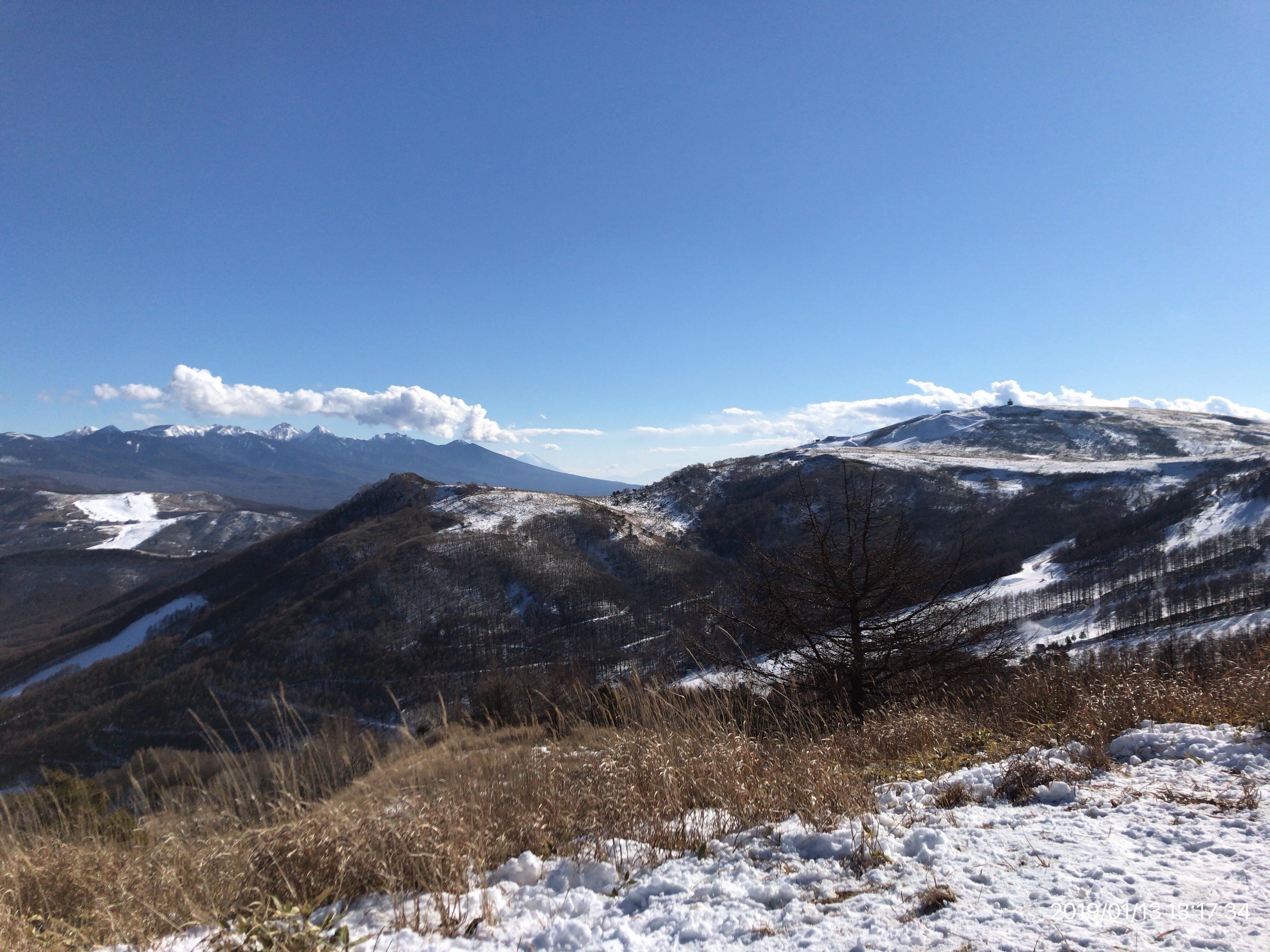 ブランシュたかやまスキー場の頂上部から眺めた車山高原と、その先にある八ヶ岳の山並みです。